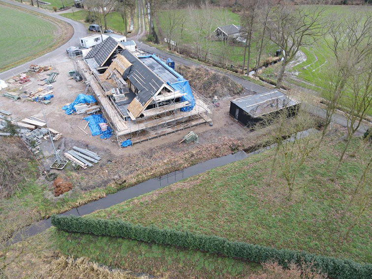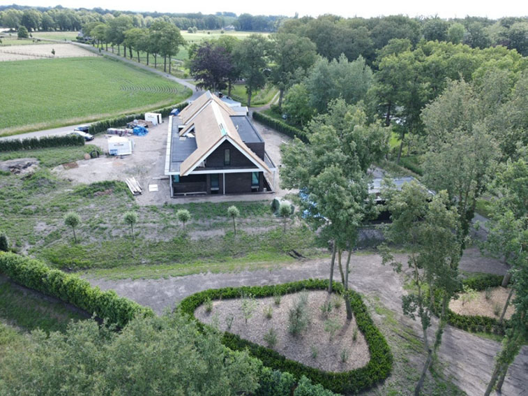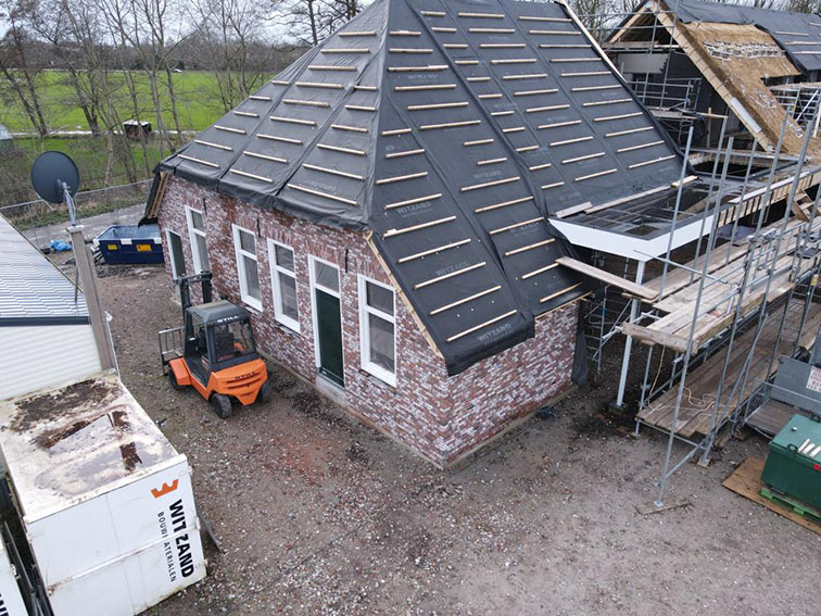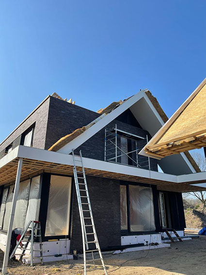 De woning wordt volledig voorzien van een rieten kap, wat bijdraagt aan de landelijke charme. Bijzonder detail: de voorgevel van de oorspronkelijke boerderij is geïntegreerd in het nieuwe ontwerp, waardoor oud en nieuw op harmonieuze wijze samenkomen.