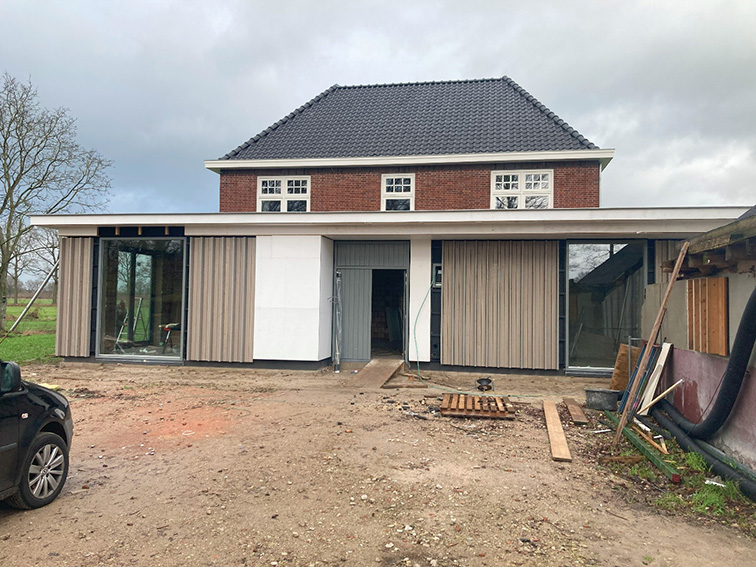 Voor deze klant hebben wij een complete transformatie gerealiseerd van een oude boerderij. Slechts drie buitenmuren zijn behouden gebleven; de rest van het pand is volledig gesloopt, opnieuw opgebouwd en voorzien van moderne isolatie. Aan de achterzijde is een royale aanbouw toegevoegd, waardoor de woning aanzienlijk is vergroot en aangepast aan hedendaagse woonwensen.
