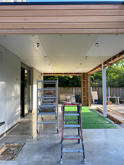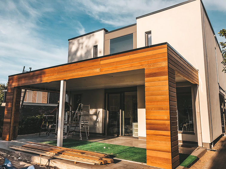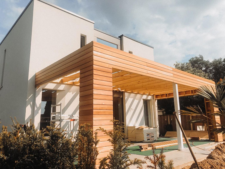 Voor een klant in Groenlo hebben wij rondom de woning drie verschillende overkappingen gerealiseerd. Achter het huis is een overkapping geplaatst met een natuurlijke afwerking in Red Cedar. Aan de zijkant loopt een tweede overkapping door naar de voorzijde, afgewerkt met zwarte Alucobond — een materiaal dat zorgt voor een strakke, naadloze dakrand. Boven de achterdeur is een derde luifel aangebracht, eveneens uitgevoerd in zwarte Alucobond.