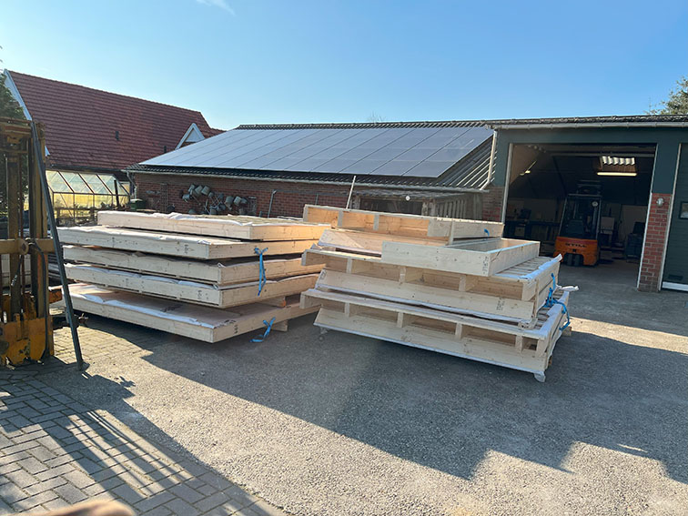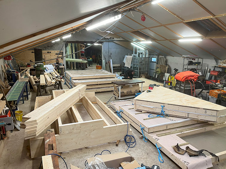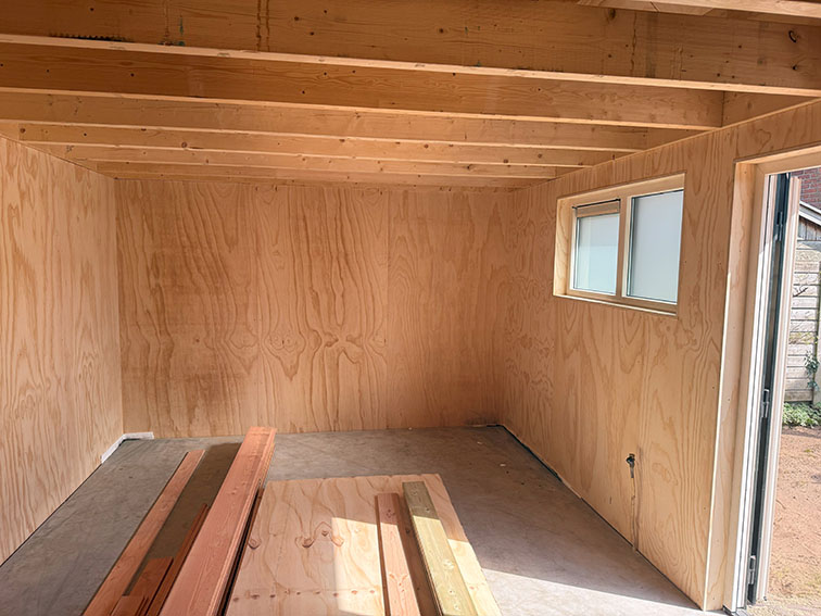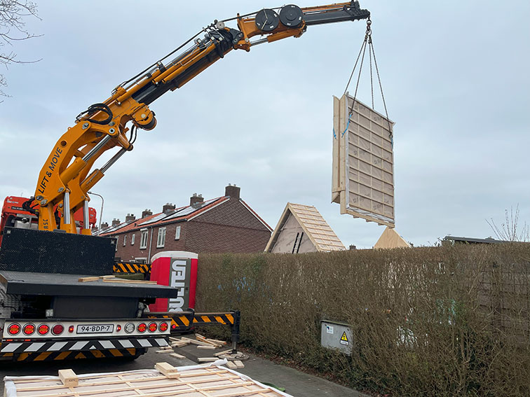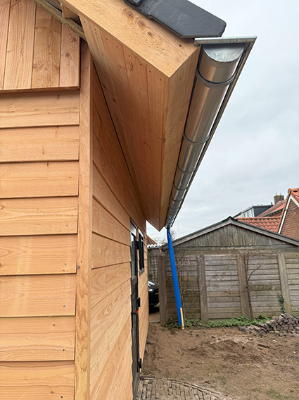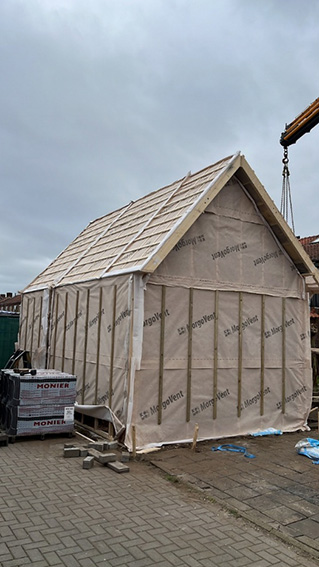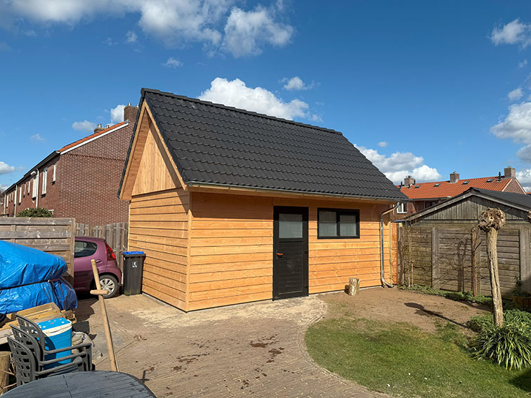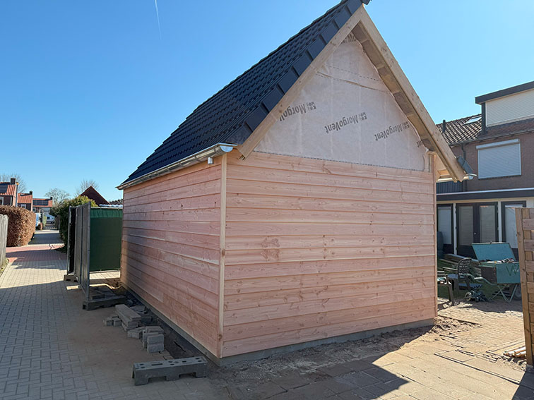 Voor een klant in Doetinchem hebben wij een complete prefab schuur gerealiseerd. De constructie is in onze werkplaats voorbereid en in één dag op locatie geplaatst met behulp van een autolaadkraan. De buitenzijde is afgewerkt met zwart Zweeds rabat, terwijl de binnenkant is voorzien van underlayment. De schuur is gebouwd op een strakke monoliet afgewerkte betonvloer.